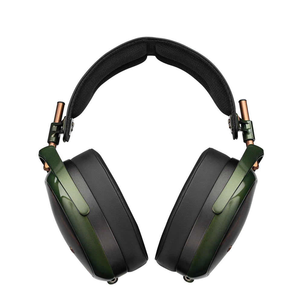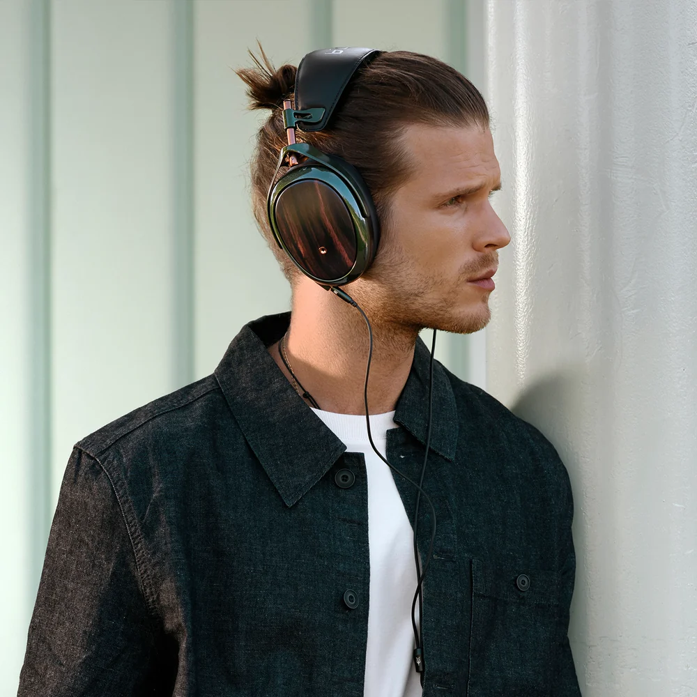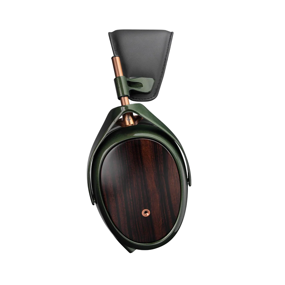 The ear cups are adorned in Macassar ebony – a heavy, dense, and aesthetically pleasing hardwood known for its deep, rich brown coloration punctuated by intricate golden-brown stripes.